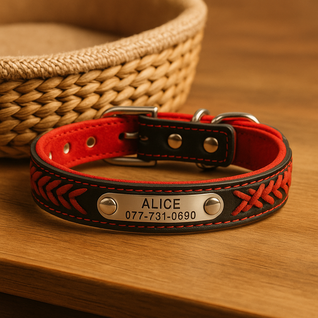Le vrai point fort de ce collier est la plaque personnalisable en métal doré où le nom de votre chien et votre numéro de téléphone seront gravés avec une précision impeccable. Cette personnalisation ne garantit pas uniquement que votre chien sera identifié en cas de besoin, mais ajoute un élément raffiné et personnalisé au design.
